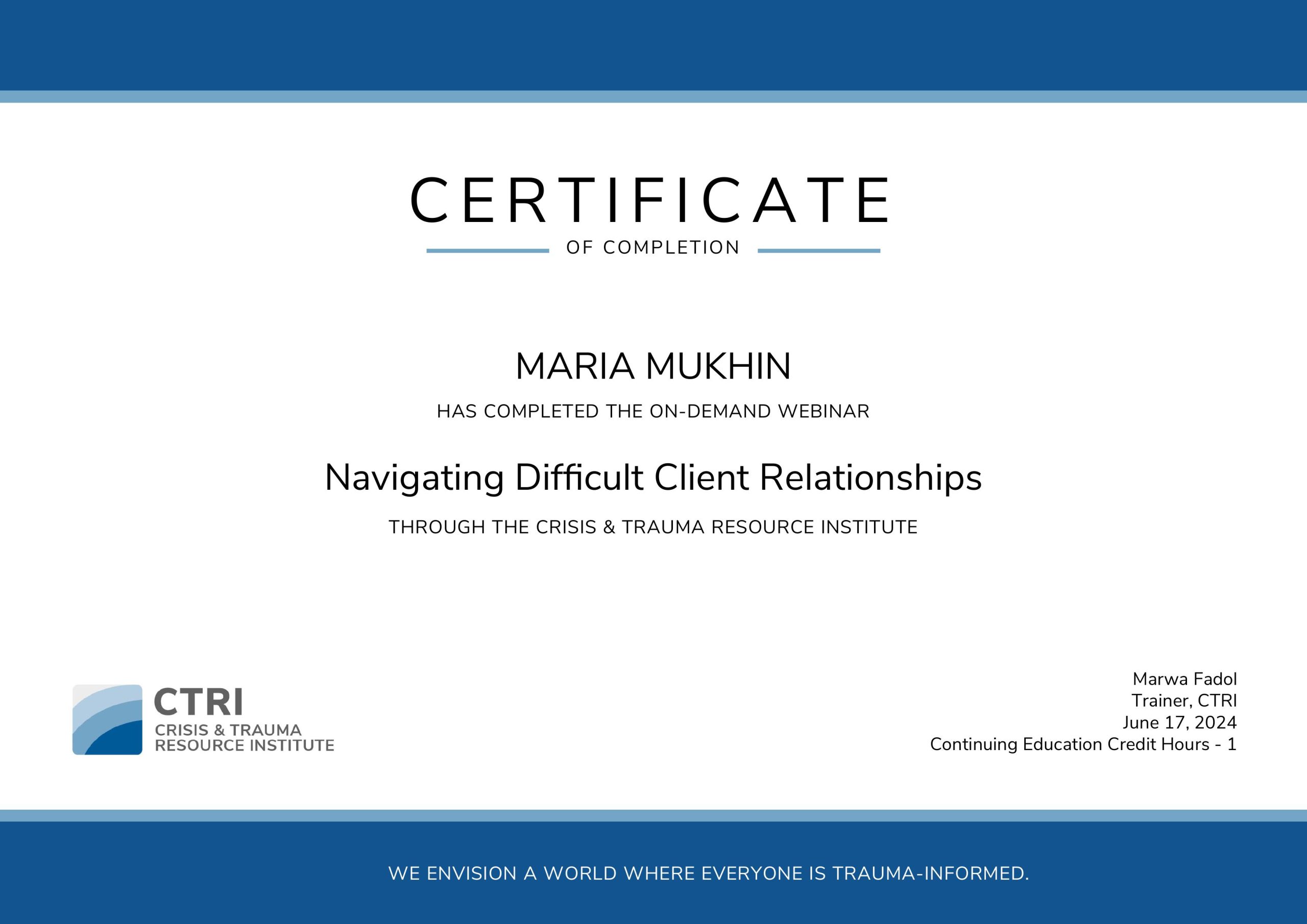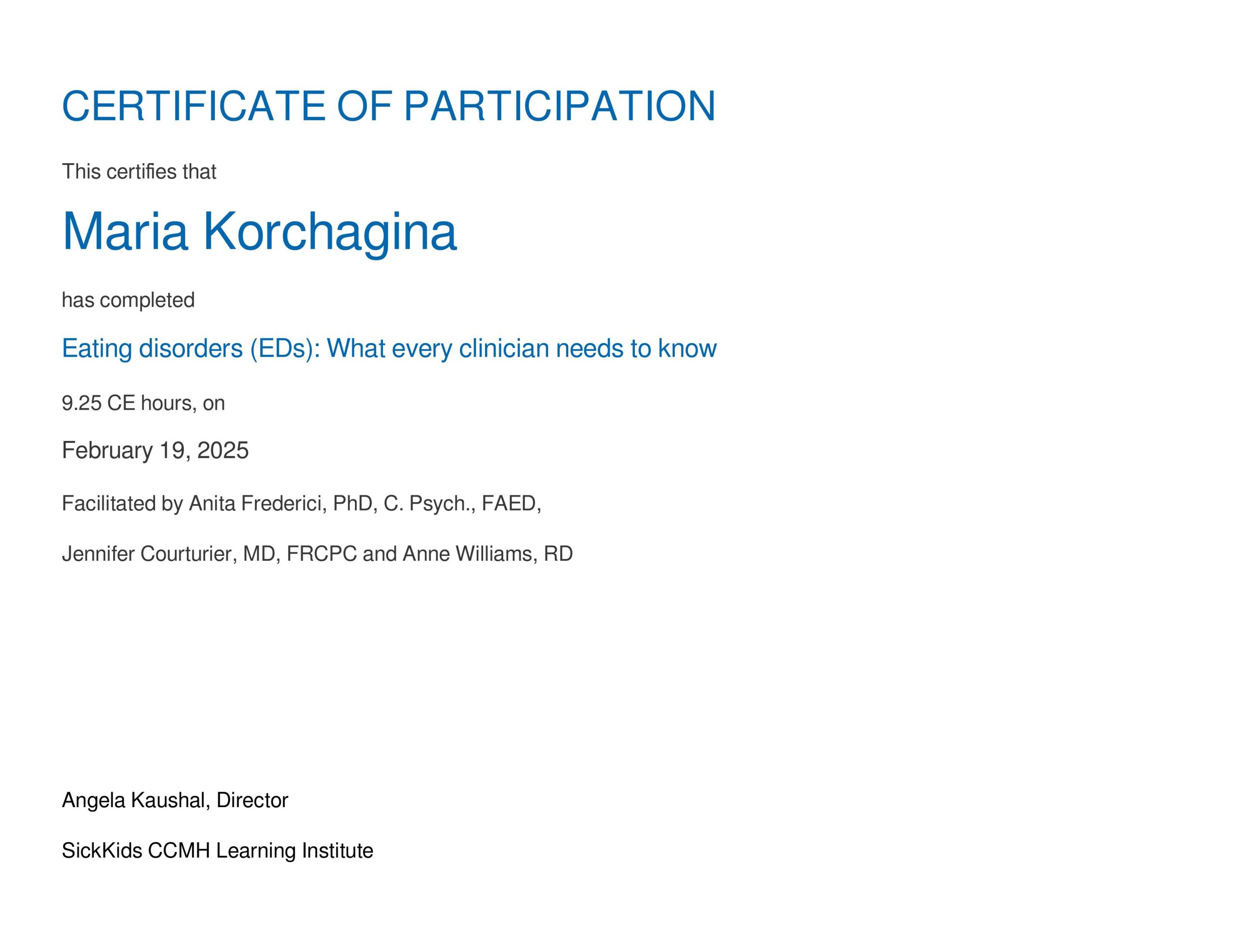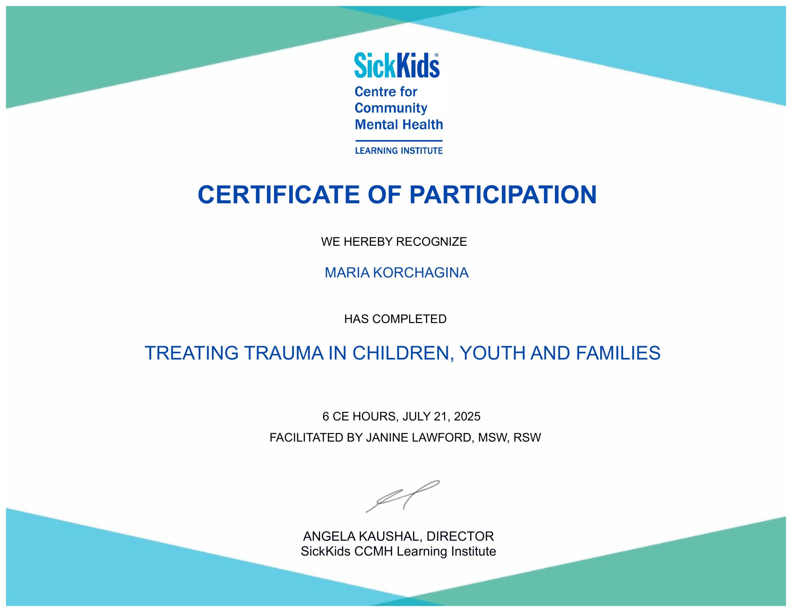 To provide evidence-based, compassionate care, I’ve completed advanced training across key areas of mental health, and I pursue ongoing education to deepen my clinical knowledge and stay current with research-backed methods in trauma recovery, neurodiversity (especially ADHD), and disordered eating.